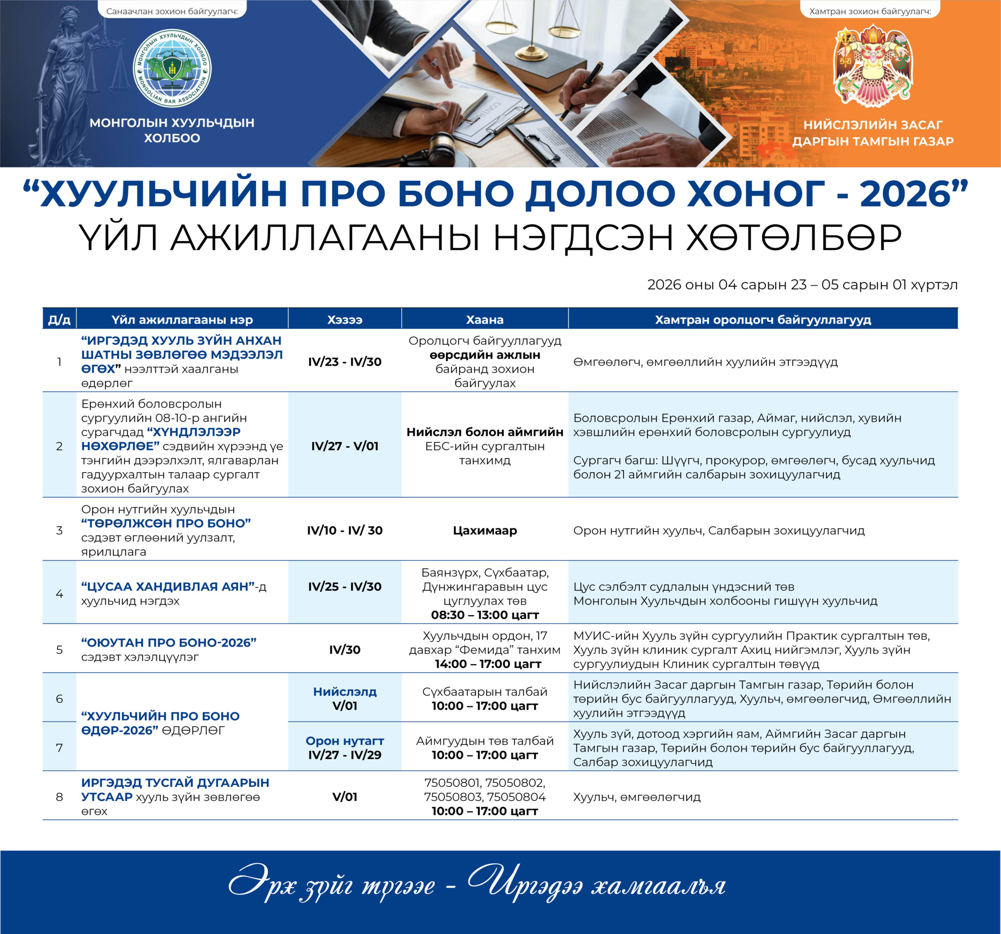 Хуульчид та бүхнийг хуульчийн нийгэмд тустай мэргэжлийн үйл ажиллагаа эрхлэх ажлын хүрээнд 2025 оны 05 дугаар сарын 01-ний өдөр Нийслэлийн төв талбай, Нэгдсэн үйлчилгээний төвүүд, анхан шатны болон хялбар ажиллагааны тойргийн шүүх, алслагдсан дүүргийн хороодод үнэ төлбөргүй хууль зүйн анхан шатны зөвлөгөө, мэдээлэл өгч ажиллахыг урьж байна.