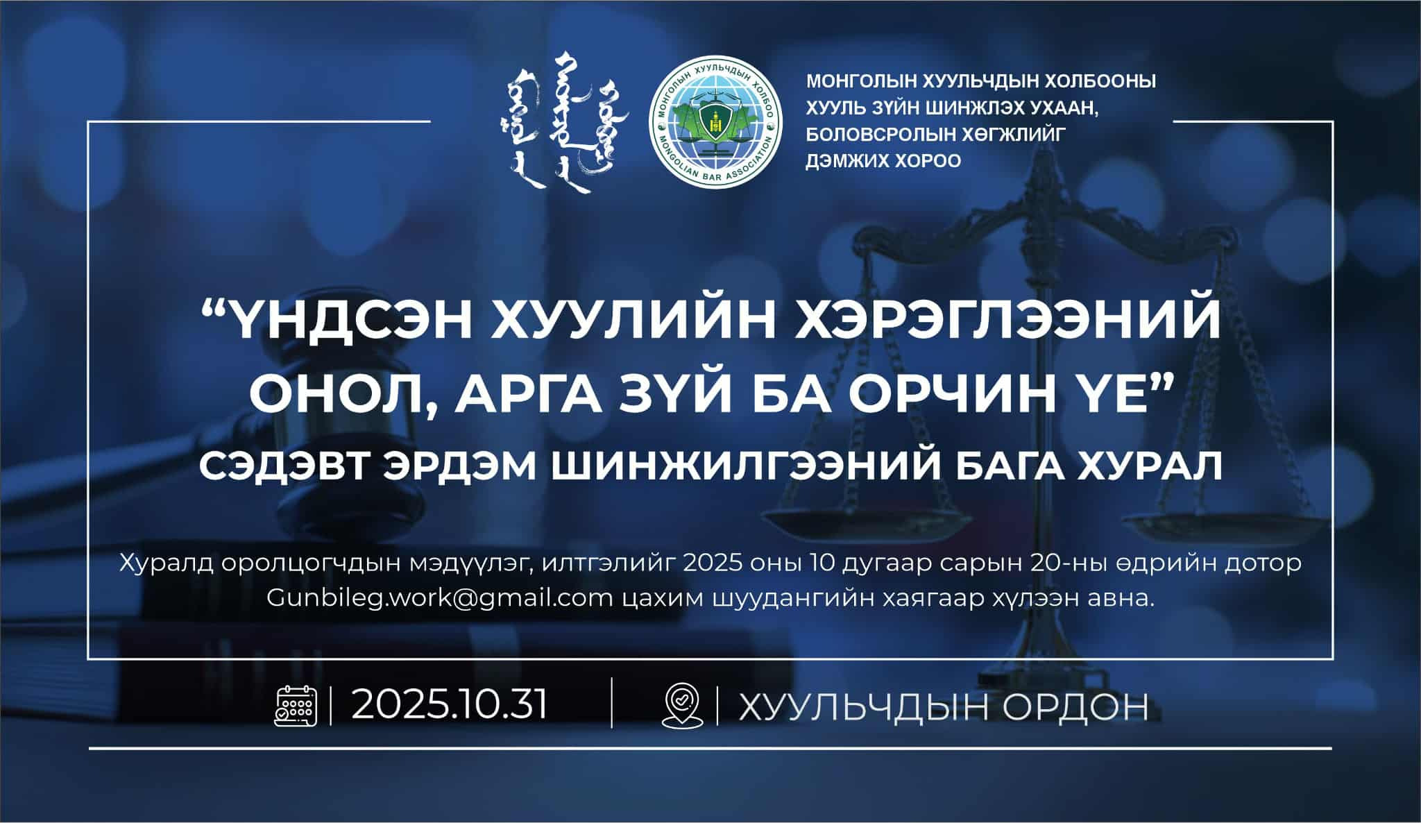 Монголын Хуульчдын холбооны Хууль зүйн шинжлэх ухаан, боловсролын хөгжлийг дэмжих хорооноос “Үндсэн хуулийн хэрэглээний онол, арга зүй ба орчин үе”сэдэвт эрдэм шинжилгээний бага хурлыг 2025 оны 10 дугаар сарын 31-ний өдөр зохион байгуулах гэж байна.