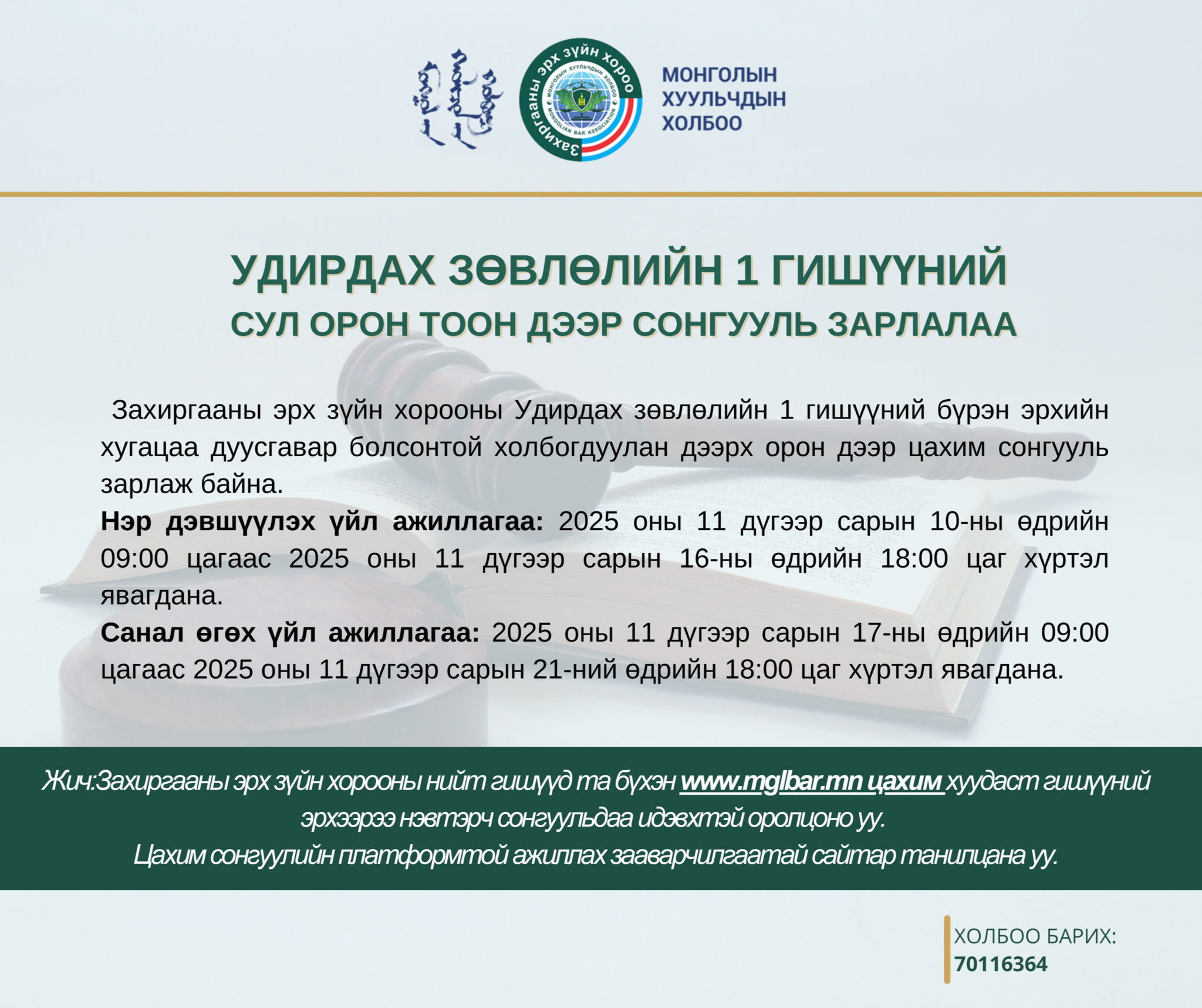Монголын Хуульчдын холбооны Захиргааны эрх зүйн хорооны Удирдах зөвлөлийн нэг гишүүний бүрэн эрхийн хугацаа дуусгавар болсонтой холбогдуулан дээрх орон дээр сонгууль зарлаж байна.