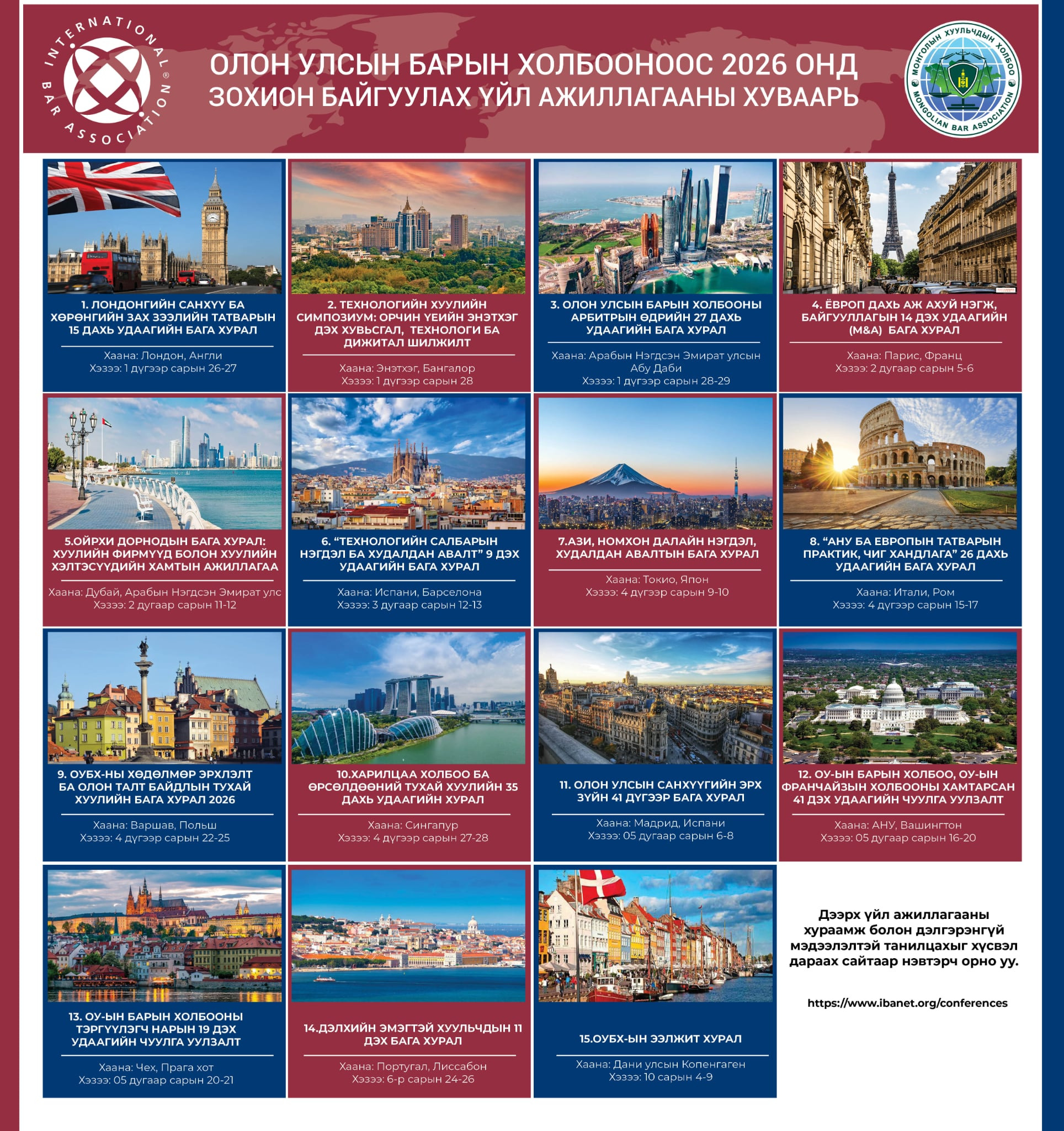Дээрх үйл ажиллагааны хураамж болон дэлгэрэнгүй мэдээлэлтэй танилцахыг хүсвэл https://www.ibanet.org/conferences сайтаар нэвтэрч орно уу.