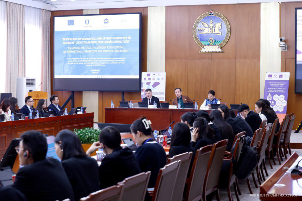 Улсын Их Хурлын Хууль зүйн байнгын хороо, Олон улсын эрх зүйн хөгжлийн байгууллага (ОУЭЗХБ)-аас Европын Холбооны санхүүжилттэй Европын Сэргээн Босголт Хөгжлийн Банктай хамтран хэрэгжүүлж байгаа “Монгол Улсад арилжааны эвлэрүүлэн зуучлалыг бэхжүүлэх нь” (2023-2025) төслийн хүрээнд өчигдөр (2025.12.01) Төрийн ордонд олон улсын онол, практикийн хэлэлцүүлгийг зохион байгууллаа.