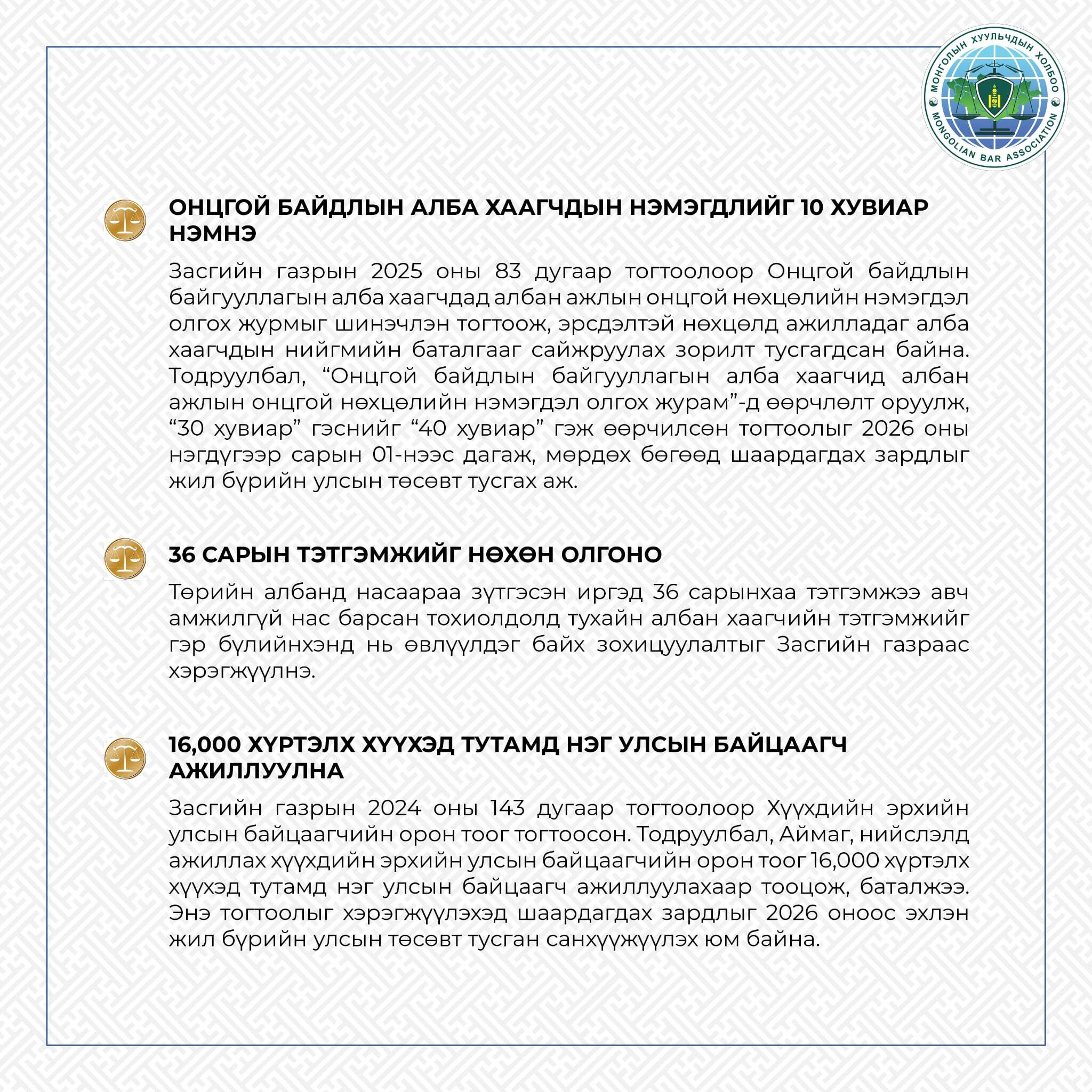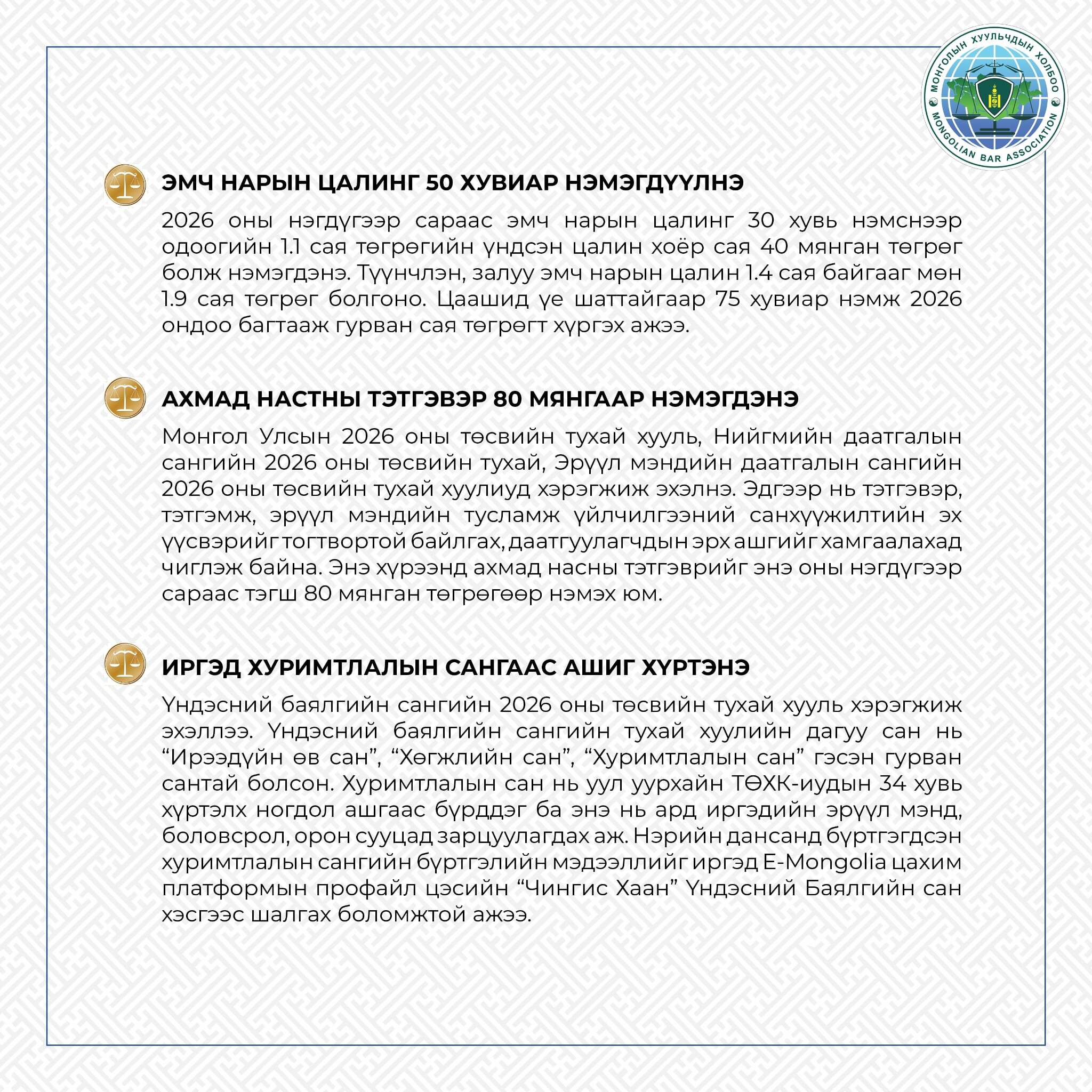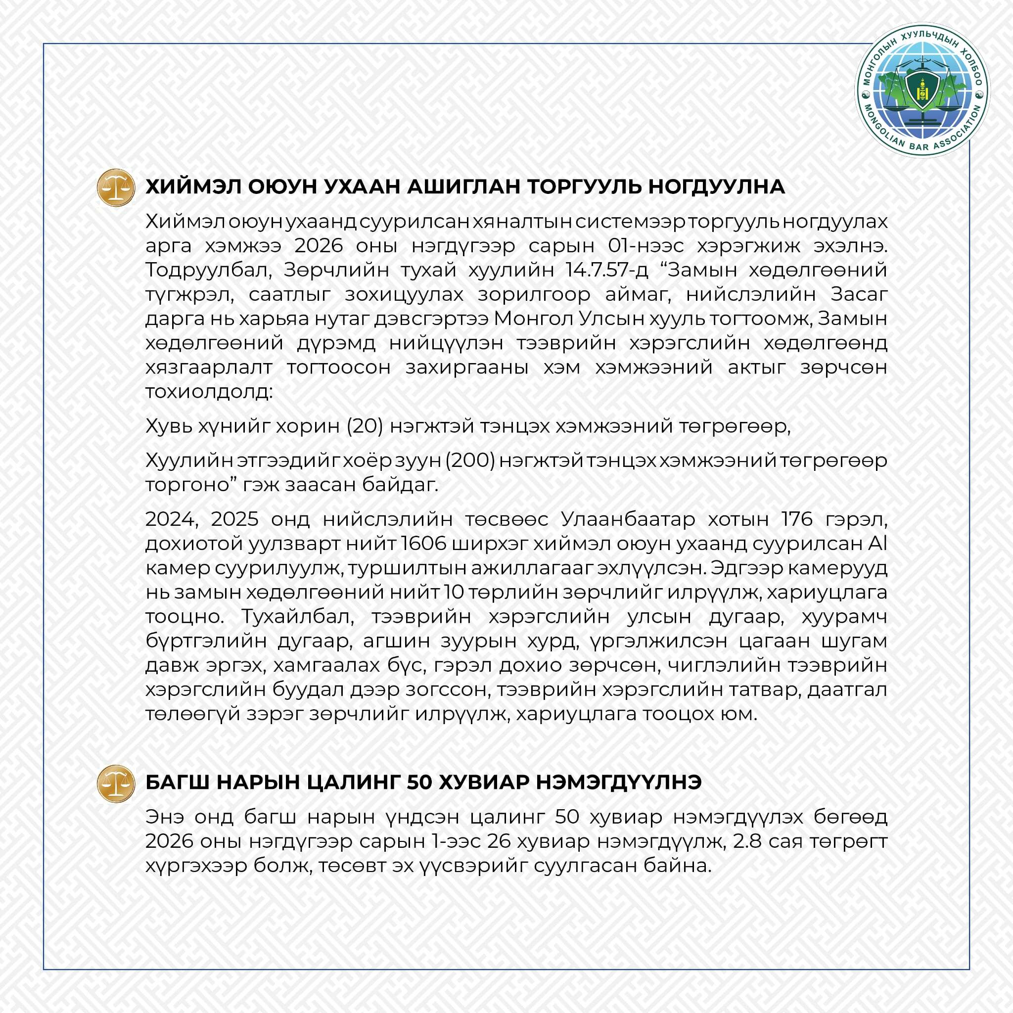 Монголын Хуульчдын холбоо нь хуульчийн нийтэд тустай мэргэжлийн үйл ажиллагааг зохион байгуулах чиг үүргийнхээ хүрээнд иргэдийн эрх зүйн боловсролыг дээшлүүлэх чиглэлээр тодорхой ажлуудыг хэрэгжүүлэхийн зэрэгцээ хууль, эрх зүйн мэдлэг олгох мэдээ, мэдээллийг бэлтгэн хүргэдэг билээ. Энэ хүрээнд Та бүхэнд 2026 оны нэгдүгээр сарын 01-ээс хэрэгжиж буй хууль, тогтоомжуудыг нэгтгэн хүргэж байна.
