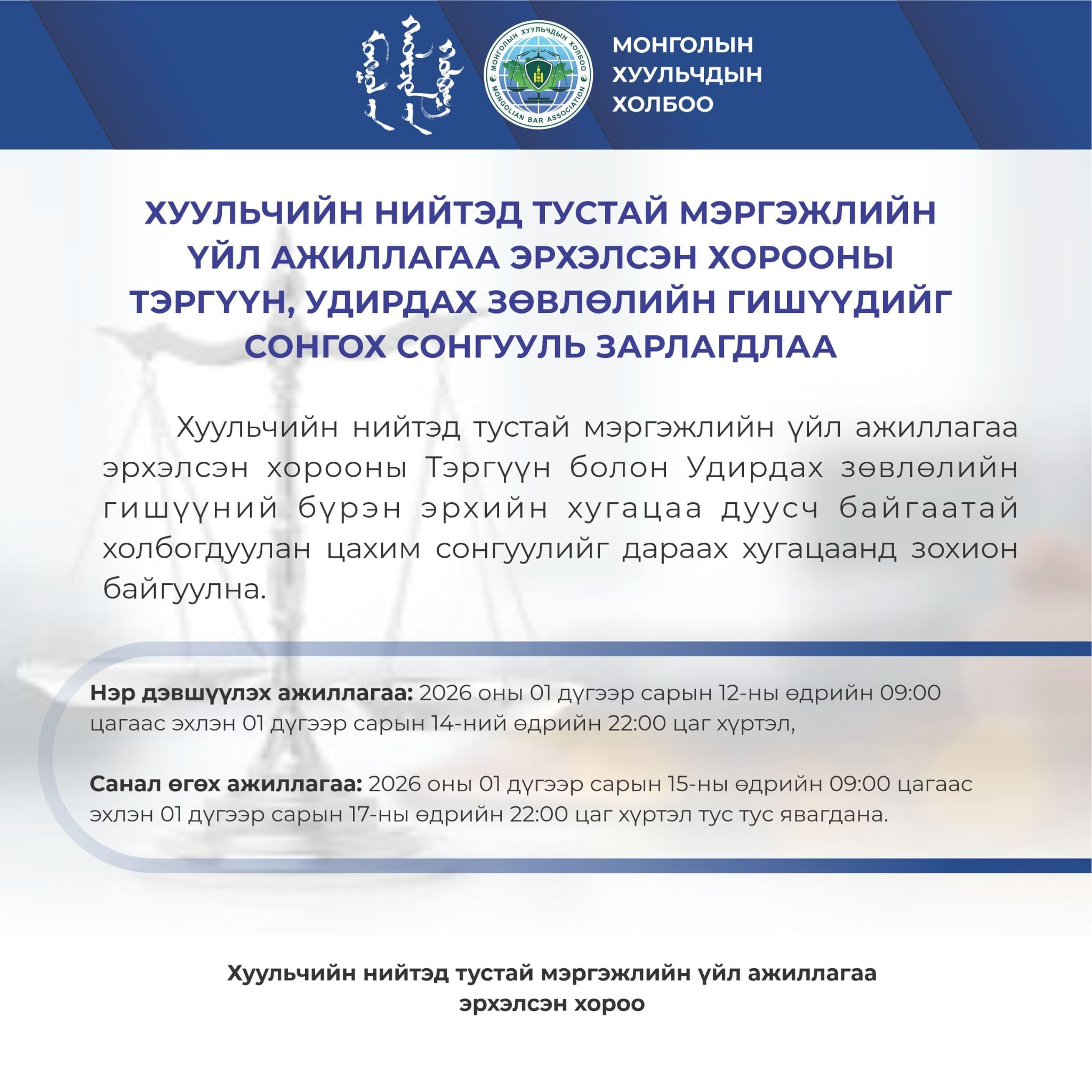 Хуульчийн нийтэд тустай мэргэжлийн үйл ажиллагаа эрхэлсэн хорооны Тэргүүн болон Удирдах зөвлөлийн гишүүдийн бүрэн эрхийн хугацаа дуусч байгаатай холбогдуулан цахим сонгууль зарлаж байна.