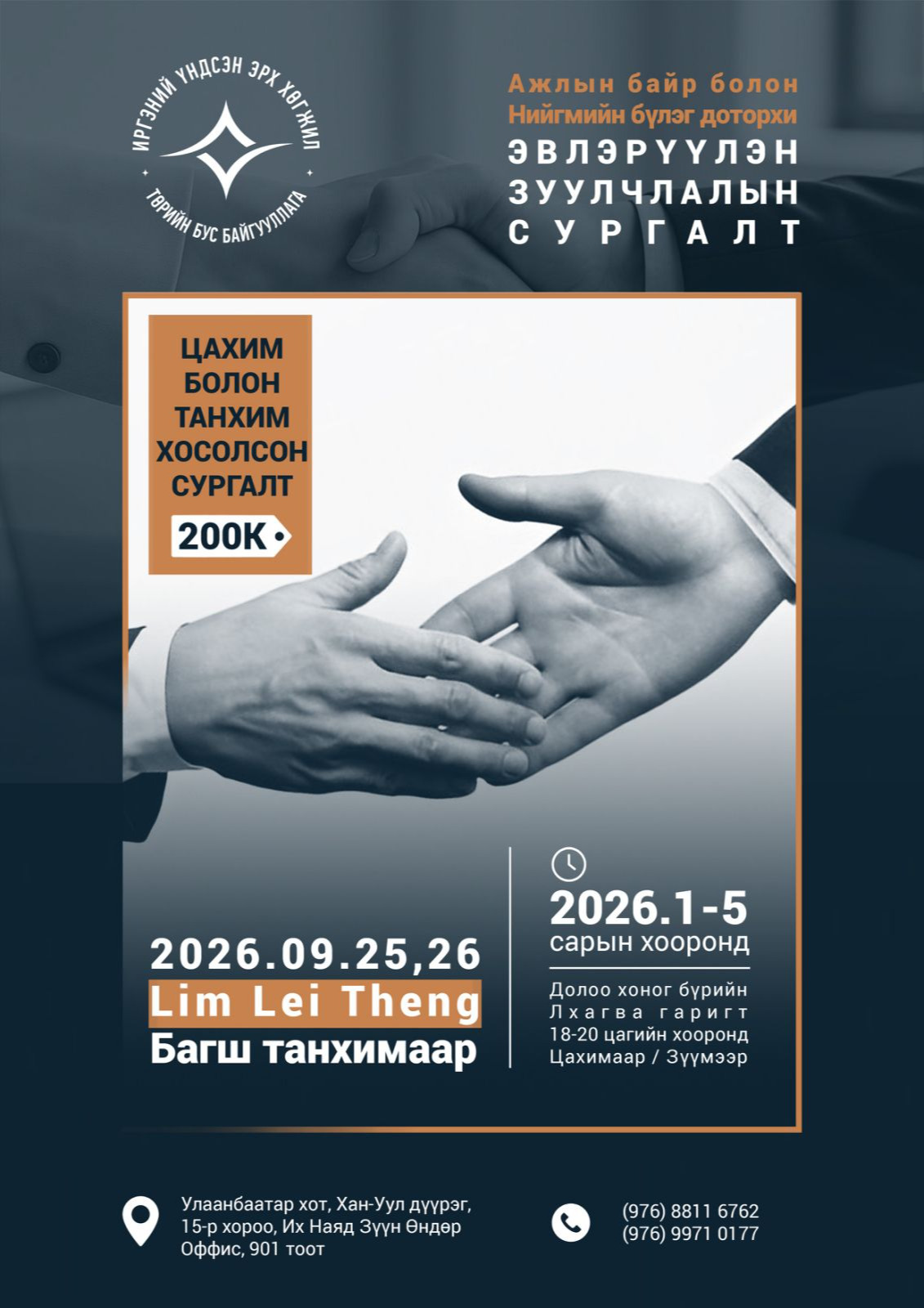 Сургалт үргэлжлэх хугацаа: 2026 оны 1-5 сард онлайнаар 12 удаа, есдүгээр сард танхимаар 2 өдөр тус тус хичээллэнэ.