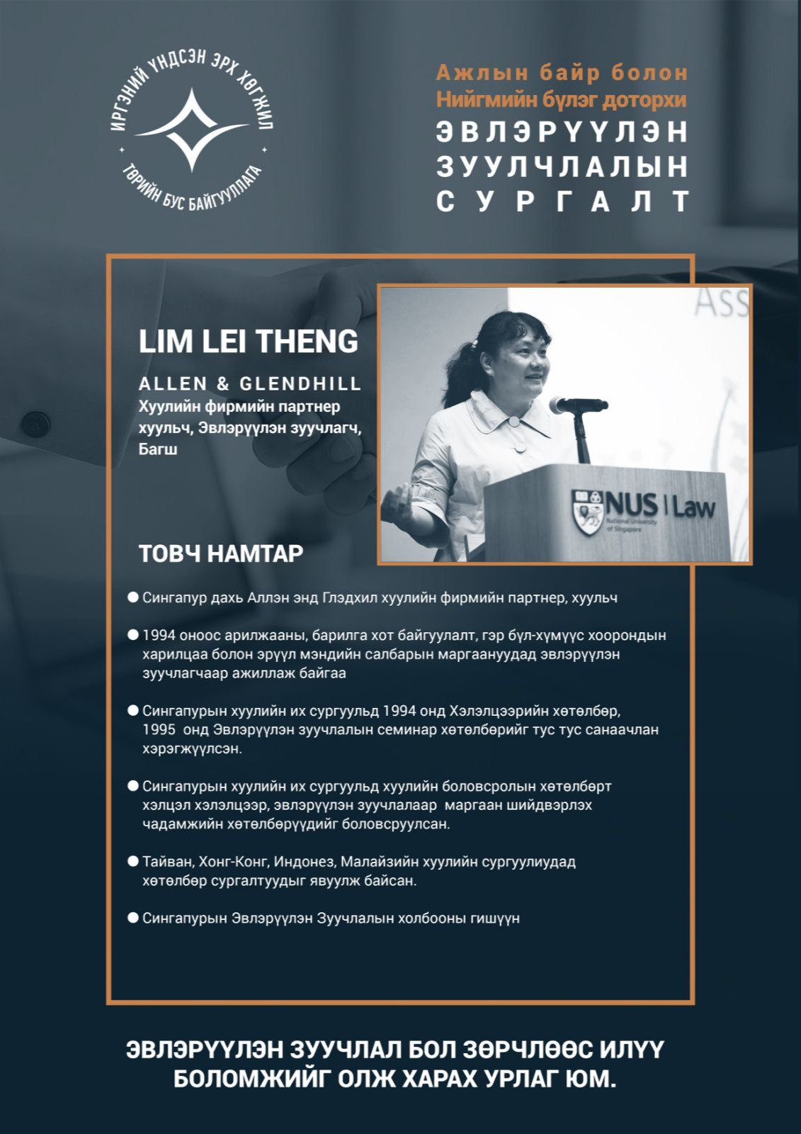 Бүртгүүлэх: Сургалтад оролцох хүсэлтэй хуульч, өмгөөлөгчид 2026.01.20-ны өдрийн 16:00 цагаас өмнө 91916935, 99710177 утсаар холбогдож бүртгүүлнэ үү.