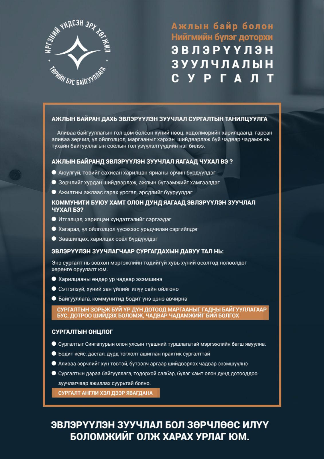 Дэлхийн хамгийн шилдэг эвлэрүүлэн зуучлалын төв болох Сингапурын Эвлэрүүлэн зуучлалын төвтэй Монголын хуульчдын холбоо, Сингапур улсын Allen & Gledhill хуулийн фирм, “Иргэний үндсэн эрх хөгжил” ТББ, Шүүхийн Ерөнхий зөвлөл, Монголын Өмгөөлөгчдийн холбоо хамтран ажлын байр, хамт олны дундах эвлэрүүлэн зуучлалын талаар урт хугацааны сургалтыг зохион байгуулах гэж байна.