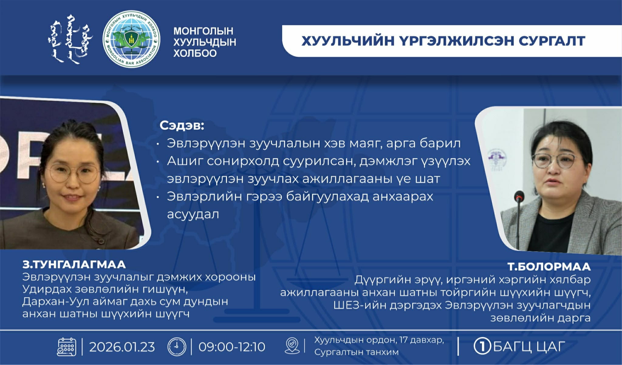Жич: Хуульчийн үргэлжилсэн сургалтын 1 багц цаг тооцно.