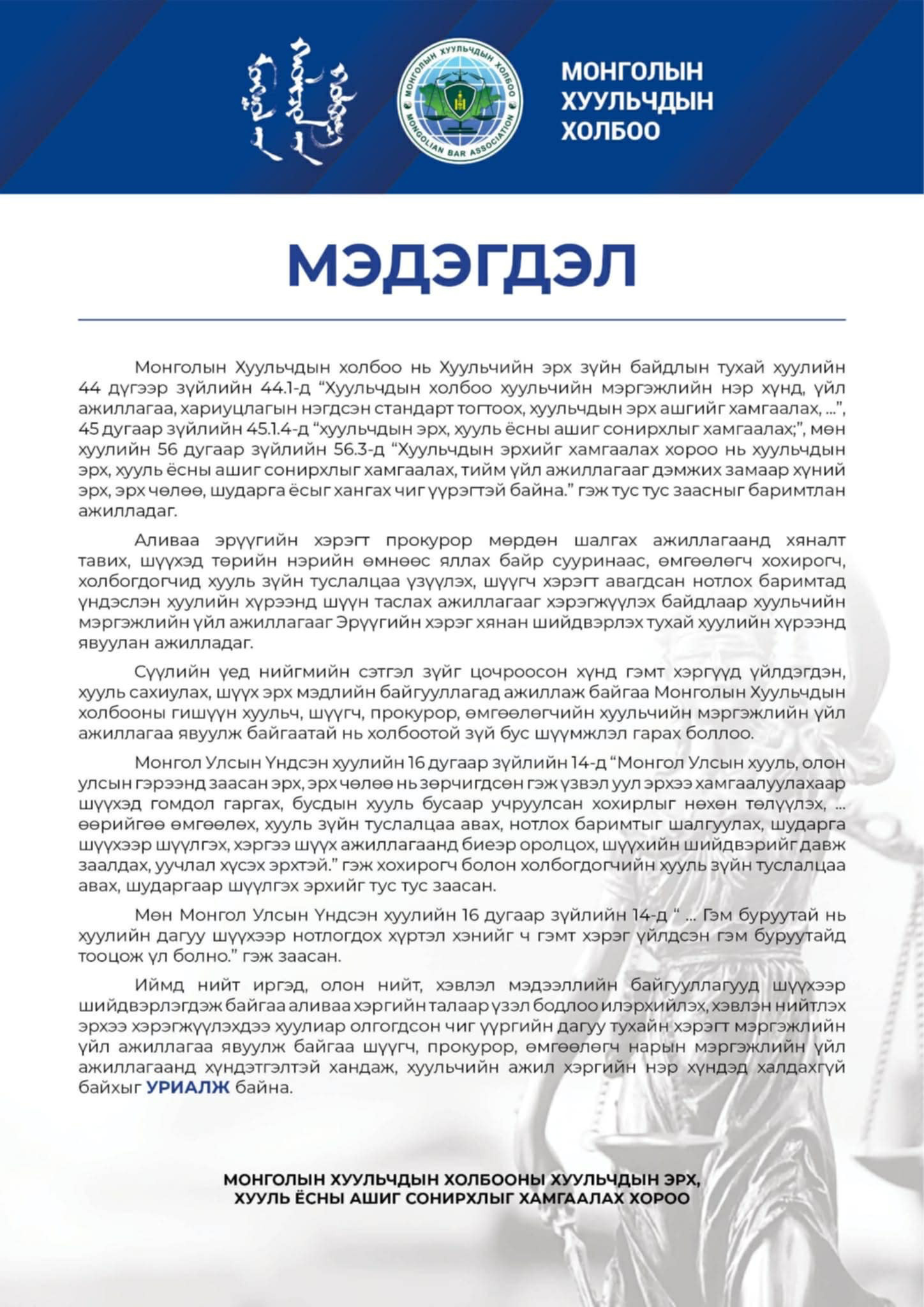ХУУЛЬЧИЙН НИЙТЭД ТУСТАЙ МЭРГЭЖЛИЙН ҮЙЛ АЖИЛЛАГАА ЭРХЭЛСЭН ХОРООНЫ ТЭРГҮҮН БОЛОН УДИРДАХ ЗӨВЛӨЛИЙН ГИШҮҮДИЙН СОНГУУЛЬ ЯВАГДАНА