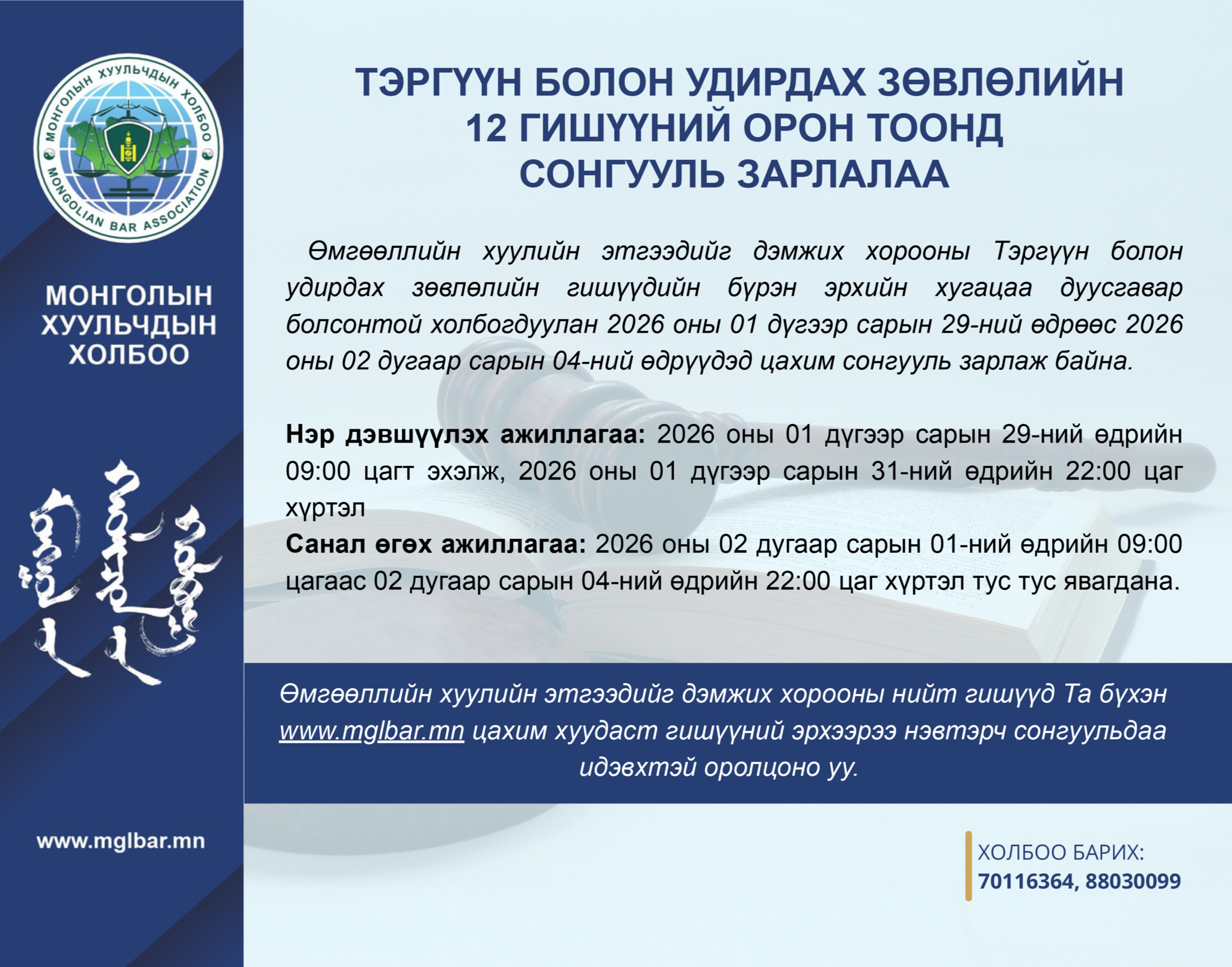 ТЭРГҮҮН БОЛОН УДИРДАХ ЗӨВЛӨЛИЙН 12 ГИШҮҮНИЙ ОРОН ТООНД СОНГУУЛЬ ЗАРЛАЛАА