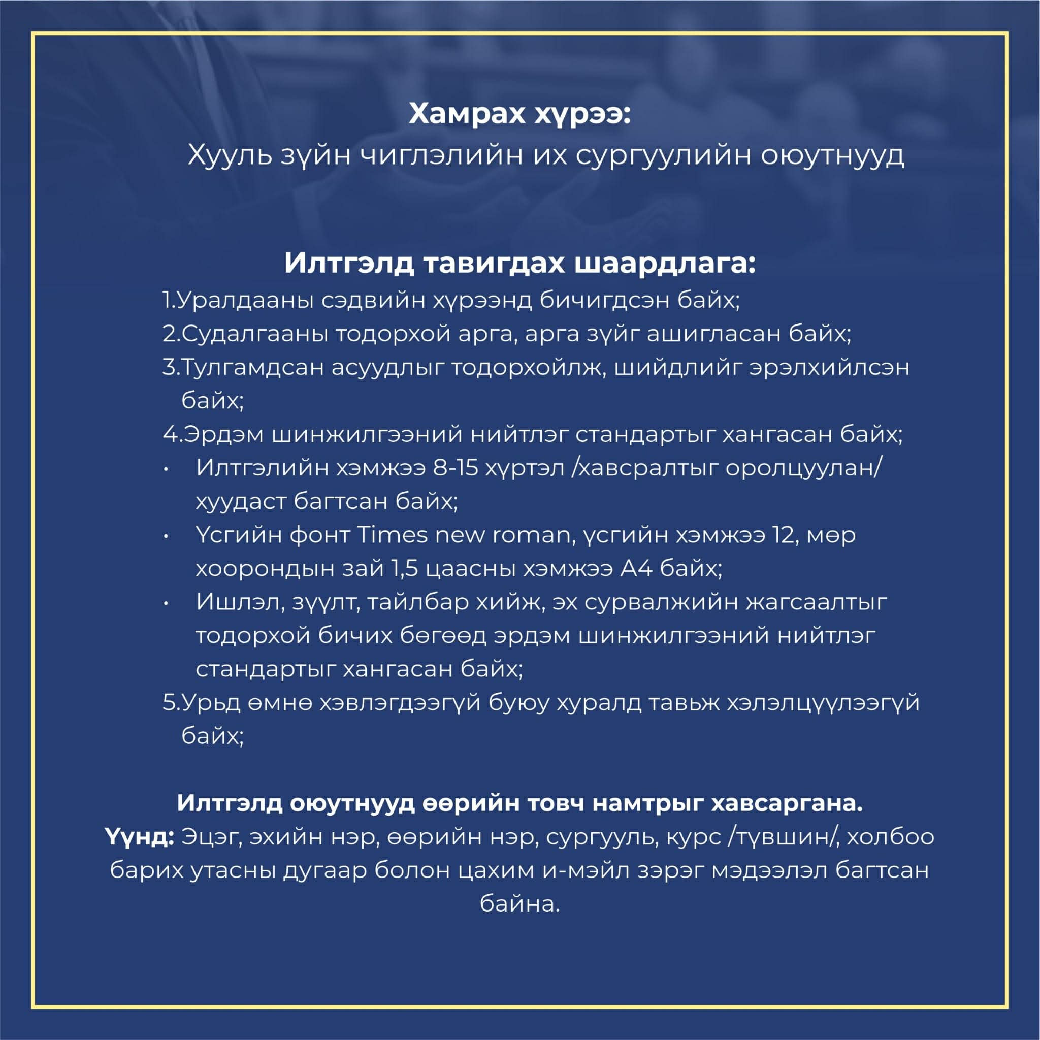 ШИНЭ ХУУЛЬЧДАД СУРГАЛТ ЗОХИОН БАЙГУУЛЛАА