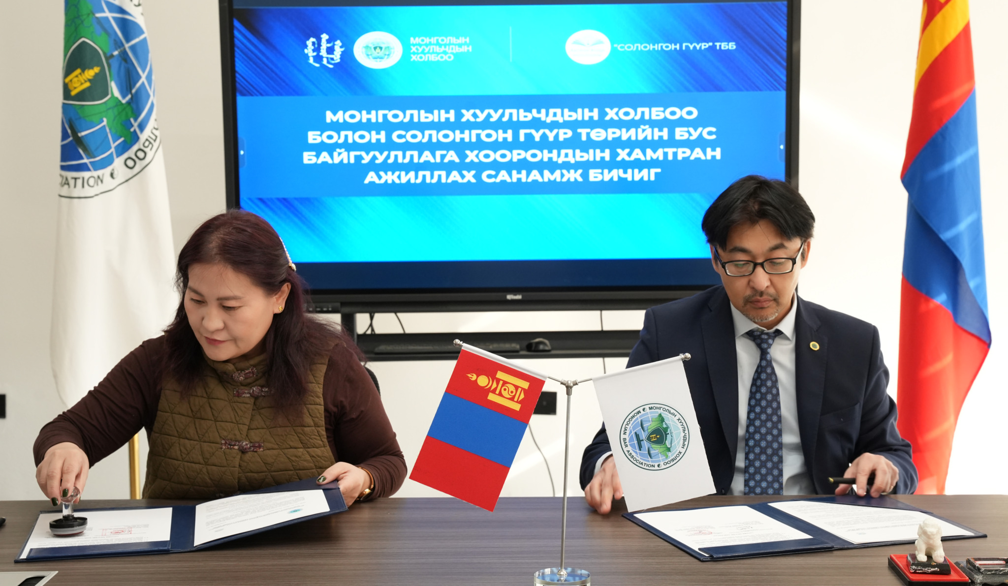 Монголын Хуульчдын холбооны Ерөнхийлөгч М.Мөнхбат, “Солонгон гүүр” төрийн бус байгууллагын гүйцэтгэх захирал Т.Хишигжаргал нар өнөөдөр хамтран ажиллах санамж бичигт гарын үсэг зурж баталгаажууллаа.