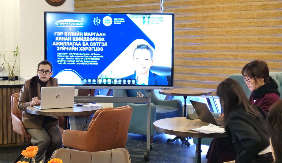 Монголын Хуульчдын холбооны Иргэний эрх зүйн хорооноос өглөөний уулзалт зохион байгууллаа. Уулзалтаар "Гэр бүлийн маргаан хянан шийдвэрлэх ажиллагаа ба сэтгэл зүйчийн хэрэгцээ" сэдвийн хүрээнд хэлэлцүүлэг өрнүүллээ.