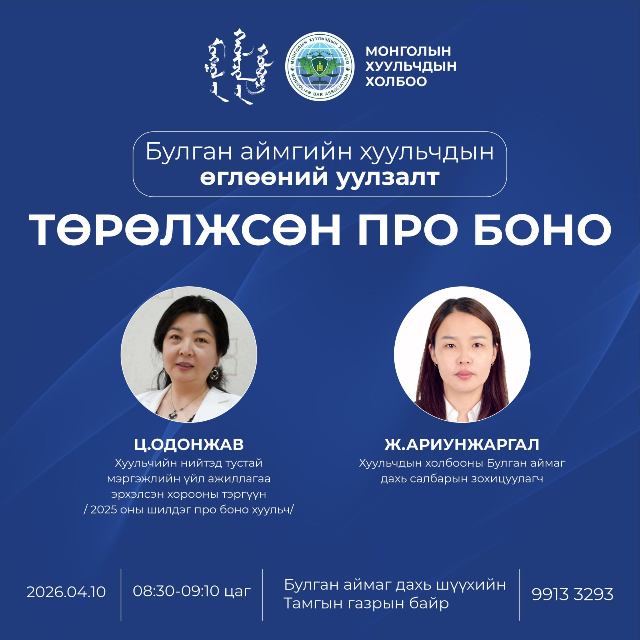 Монголын Хуульчдын холбооны Булган аймаг дахь салбараас “Төрөлжсөн про боно” сэдэвт өглөөний уулзалтыг зохион байгуулна.