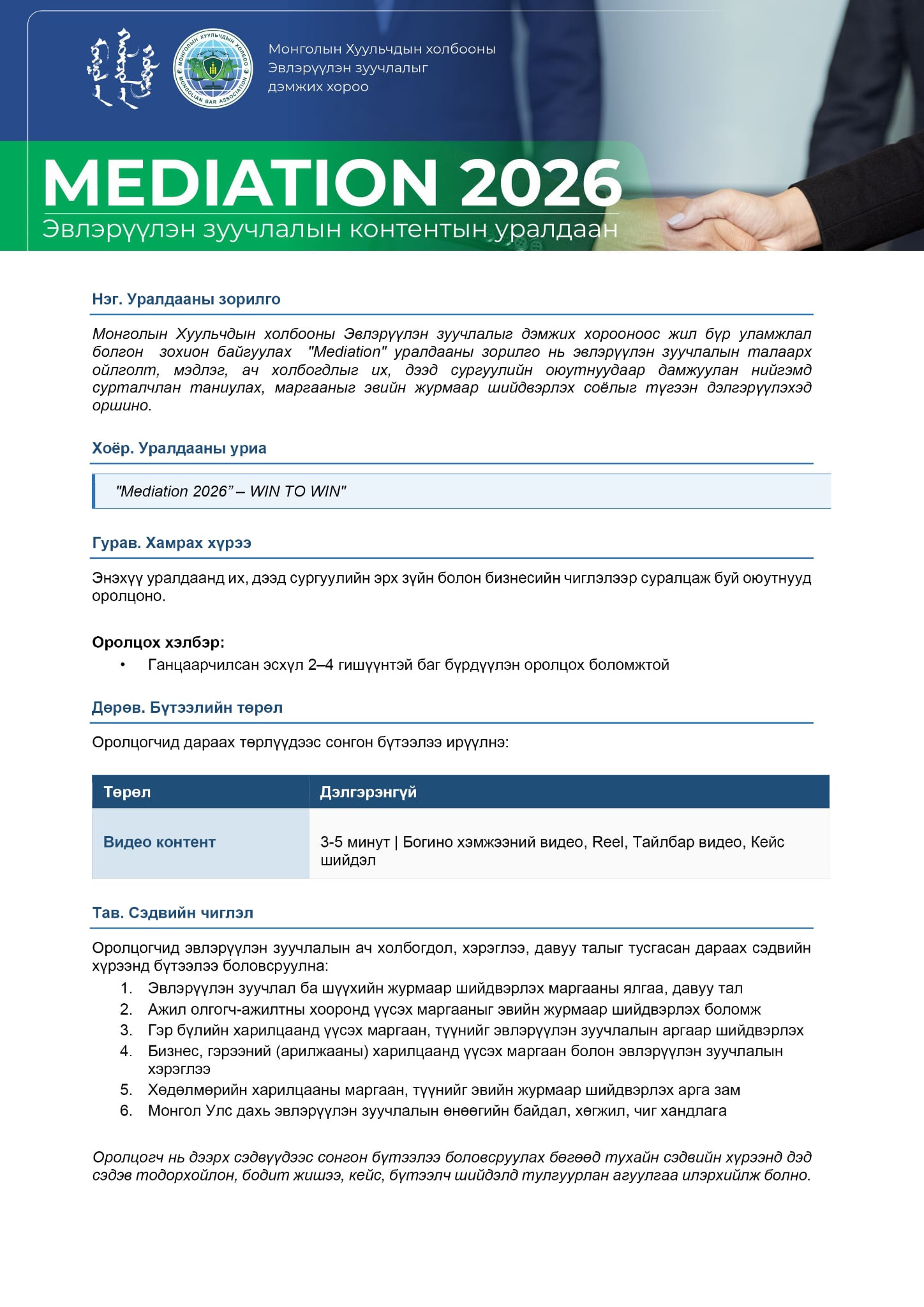 Их, дээд сургуулийн оюутнууд та бүхнийг эвлэрүүлэн зуучлалын тухай богино хэмжээний видео контентын уралдаанд оролцохыг урьж байна.
