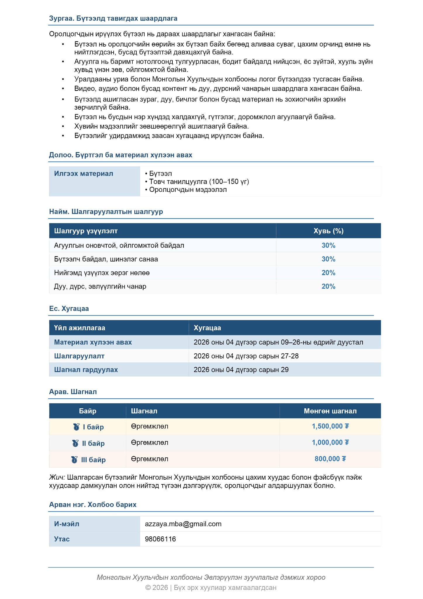 Материал хүлээн авах хугацаа: 2026.04.09-2026.04.26-ны өдрийг дуустал