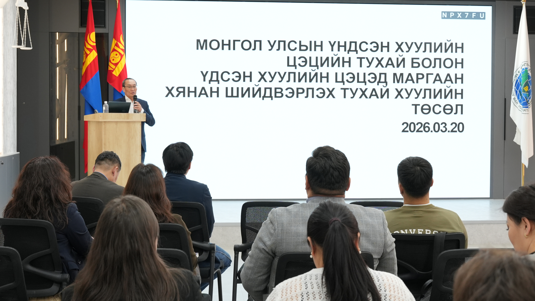 Монголын Хуульчдын холбооны Өмгөөлөгчдийн хорооноос Монгол Улсын Их Хурлын гишүүн Х.Тэмүүжинтэй хамтран “Монгол Улсын Үндсэн хуулийн цэцийн тухай хуулийн шинэчилсэн найруулгын төсөл болон Үндсэн хуулийн цэцэд маргаан хянан шийдвэрлэх тухай хуулийн шинэчилсэн найруулгын төсөл”-ийн хэлэлцүүлгийг 2026 оны 04 дүгээр сарын 06-ны өдөр зохион байгууллаа.