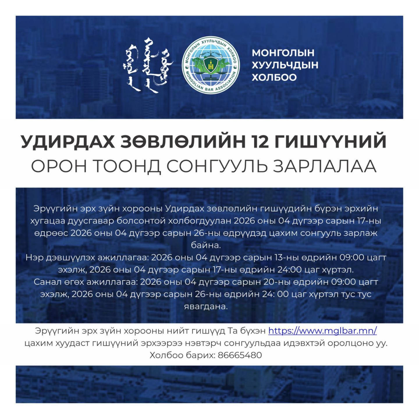 Нэр дэвшүүлэх ажиллагаа: 2026 оны 04 дүгээр сарын 13-ны өдрийн 09:00 цагт эхэлж, 2026 оны 04 дүгээр сарын 17-ны өдрийн 24:00 цаг хүртэл.