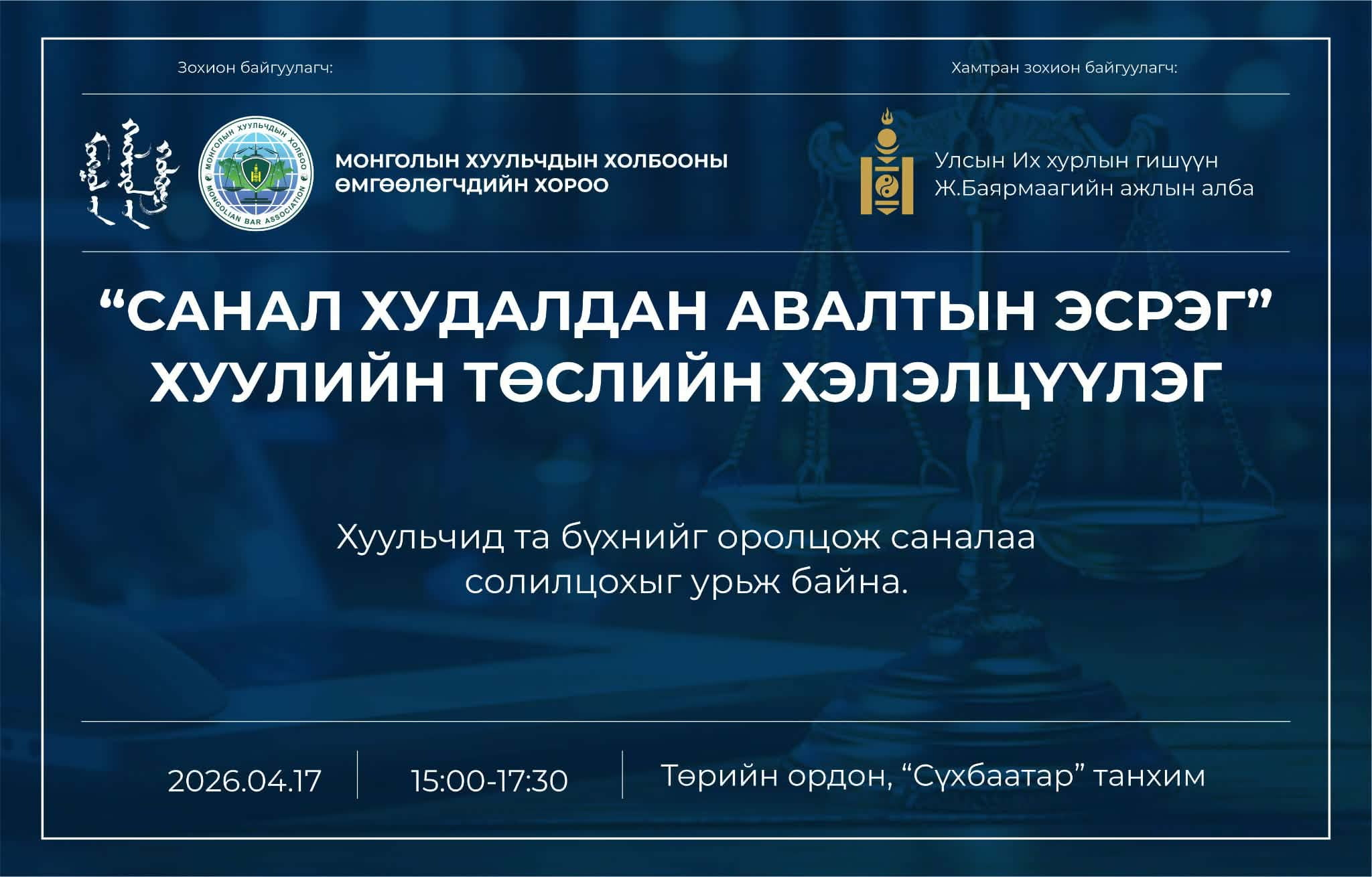 Монголын Хуульчдын холбооны Өмгөөлөгчдийн хорооноос Монгол Улсын Их хурлын гишүүн Ж.Баярмаагийн Ажлын албатай хамтран Санал худалдан авалтын эсрэг хуулийн төслийн хэлэлцүүлгийг зохион байгуулна.