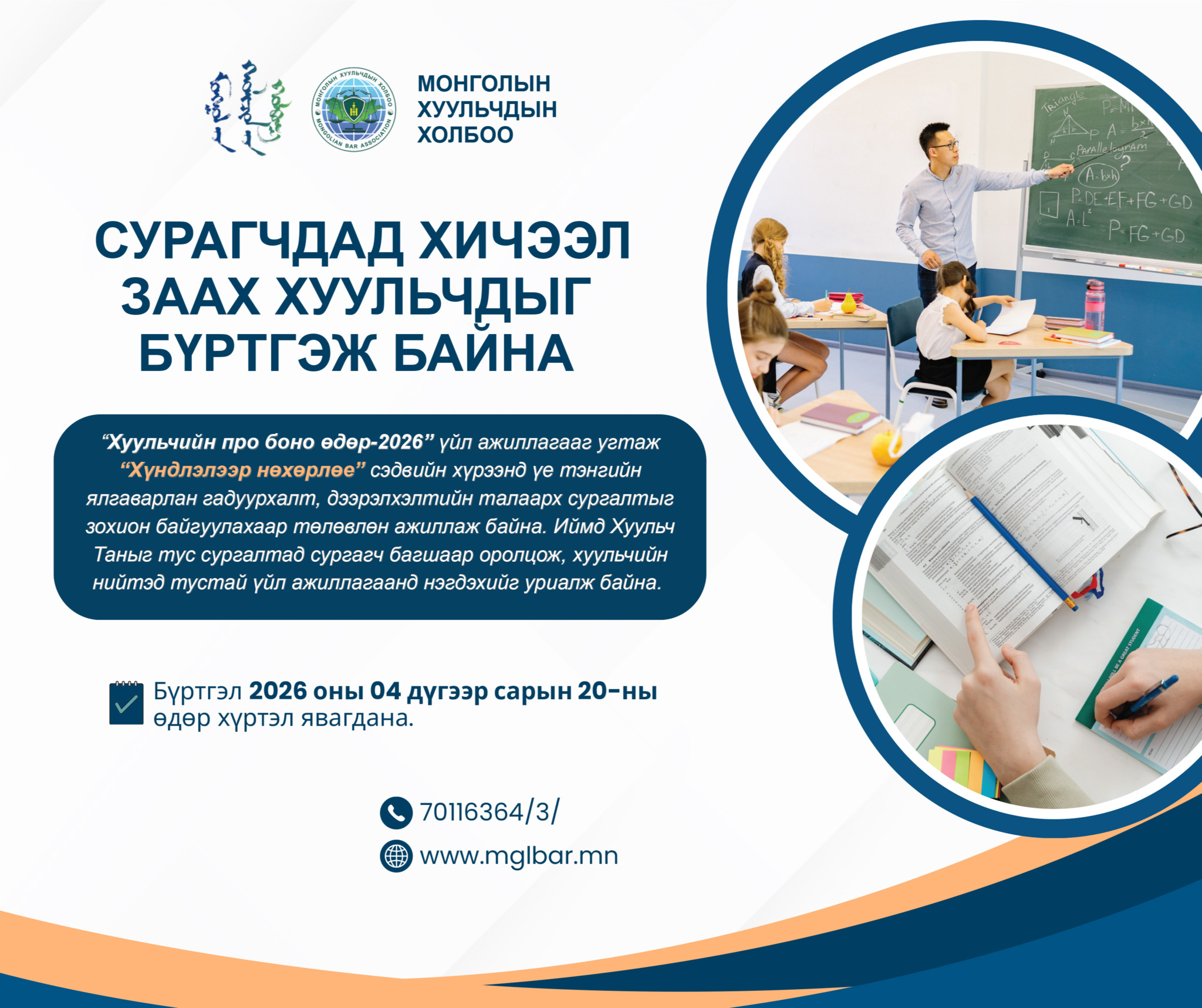 Энэ жилийн “Хуульчийн про боно өдөр-2026” үйл ажиллагааг угтаж “Хүндлэлээр нөхөрлөе” сэдвийн хүрээнд үе тэнгийн ялгаварлан гадуурхалт, дээрэлхэлтийн талаарх сургалтыг зохион байгуулахаар төлөвлөсөн бөгөөд Хуульч Таныг тус сургалтад сургагч багшаар оролцож, хуульчийн нийтэд тустай үйл ажиллагаанд нэгдэхийг уриалж байна.